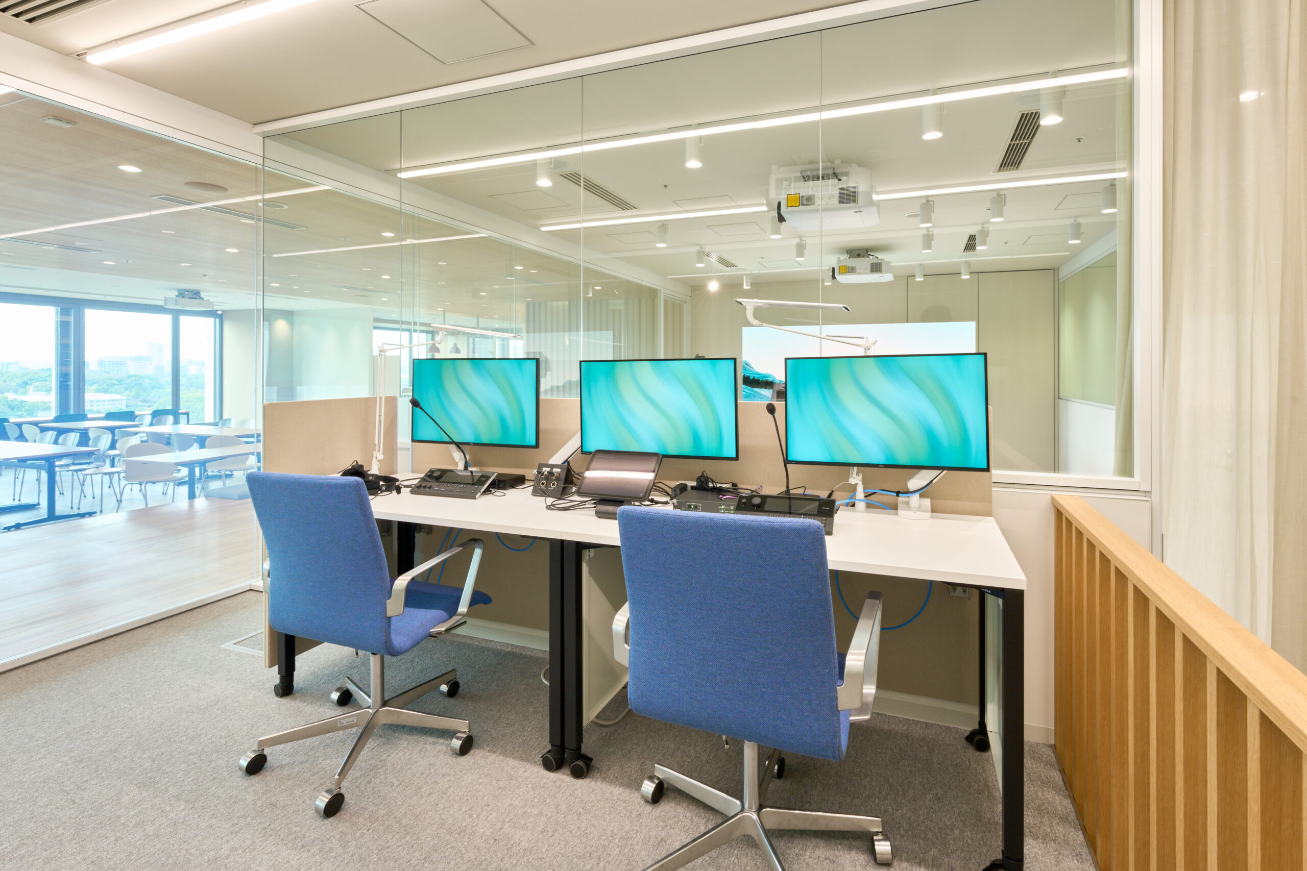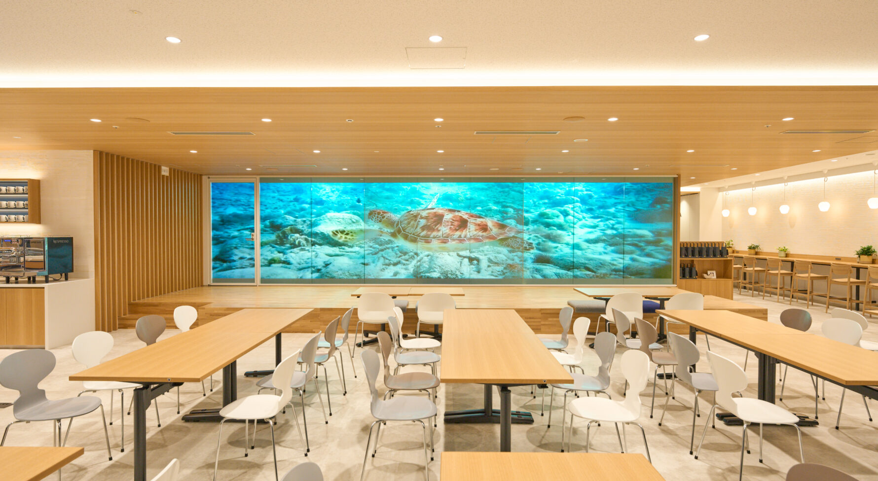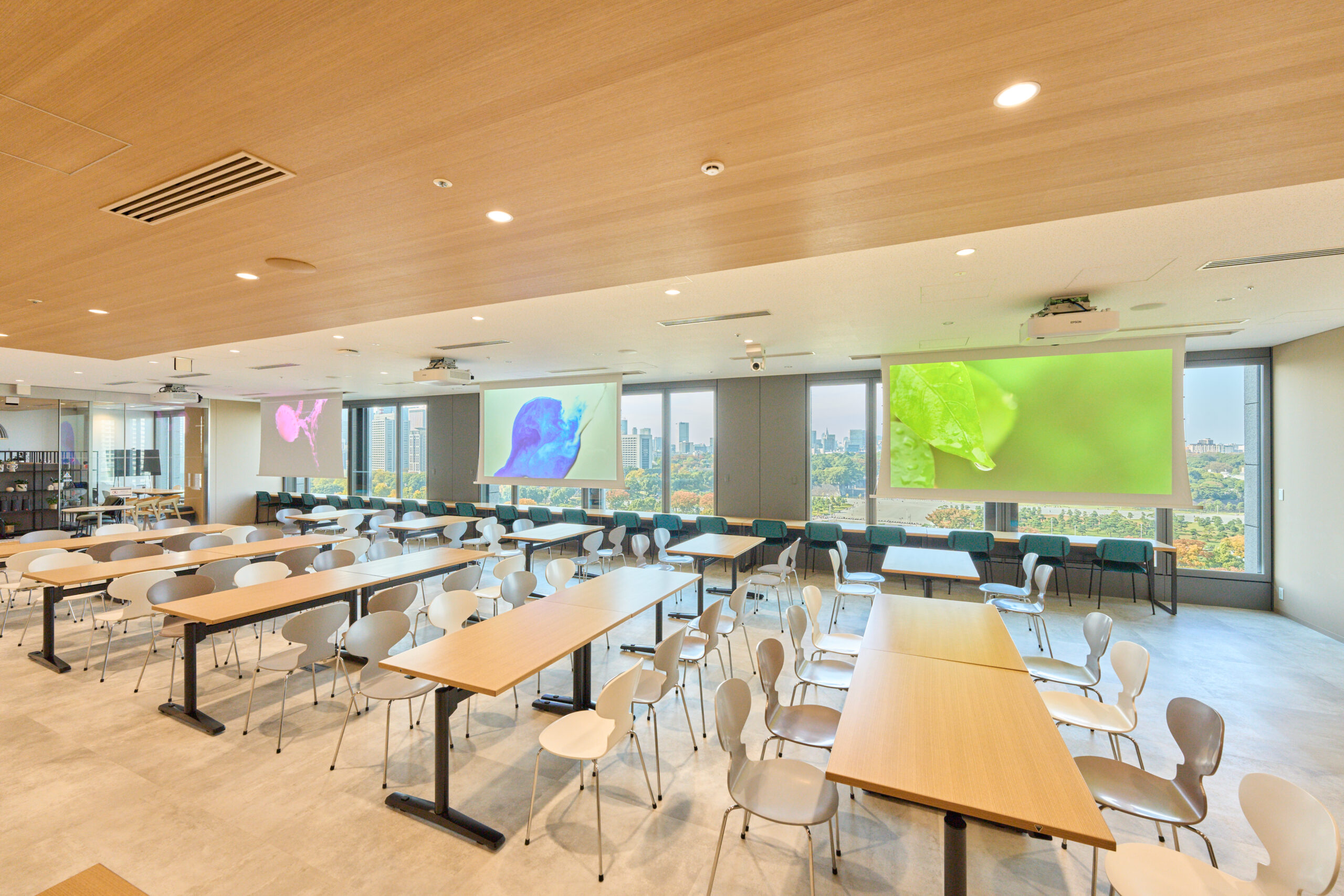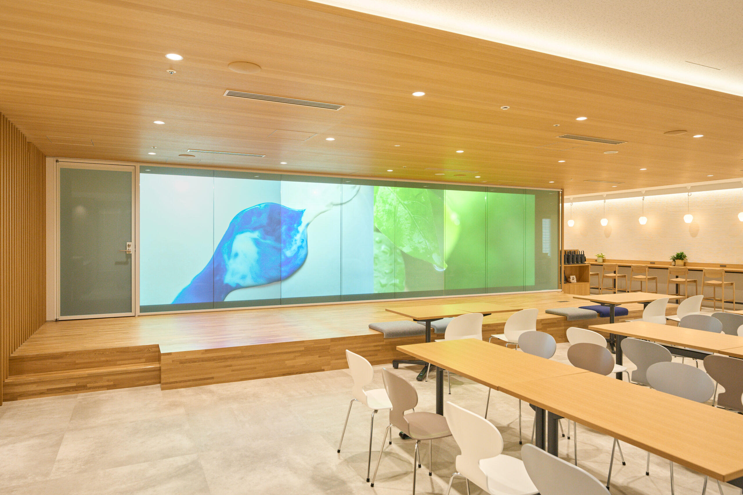 某外資系製薬会社の日本法人が東京都内に新設したカフェ・ラウンジスペースを中心に、社内外のコミュニケーションを支援するAVシステムを導入しました。本スペースは、日常的な交流の場としてだけでなく、セミナーやイベントにも対応可能な多目的空間として設計されています。意匠性の高いフレキシブルな映像表示をはじめ、Web会議や同時通訳システム、さらに企業内スタジオ機能を完備し、多様なニーズに応える柔軟性の高い環境を構築しました。また、AVコントローラには入力映像のサムネイル表示を採用し直感的な操作を実現。自動追尾撮影や入力検知によるシステムの切り替えなど、細やかな自動化機能を組み込むことで、利用者の負担を抑えながら円滑で自然なコミュニケーションを支えています。