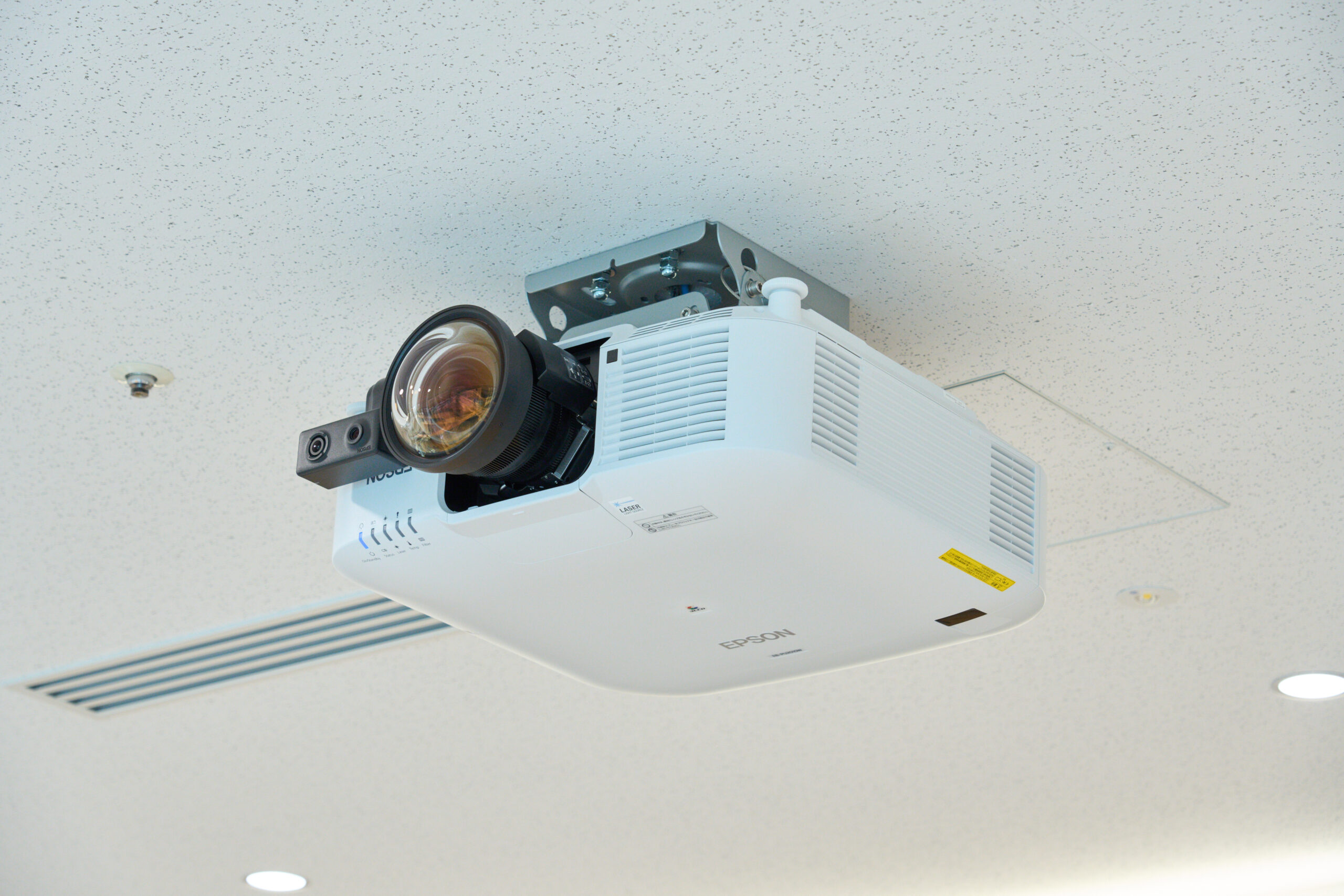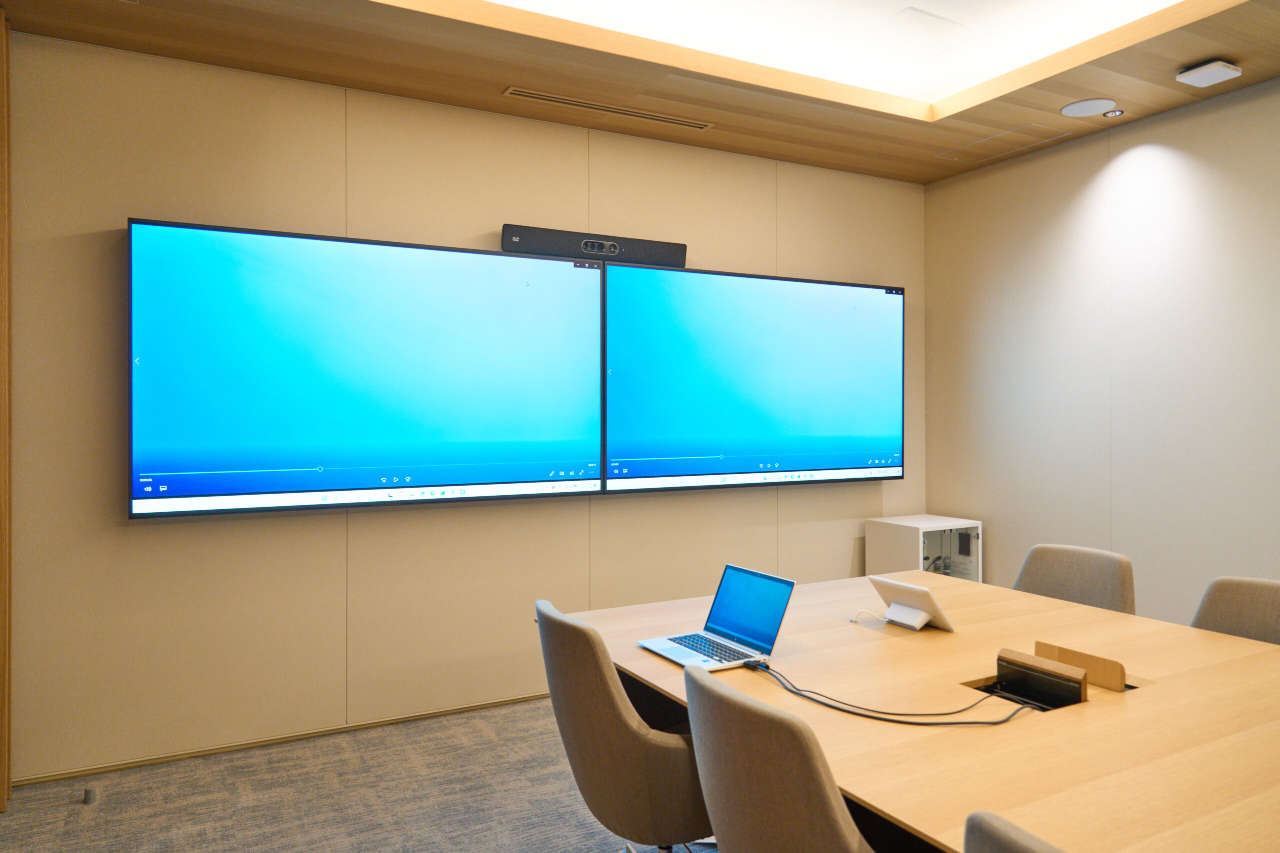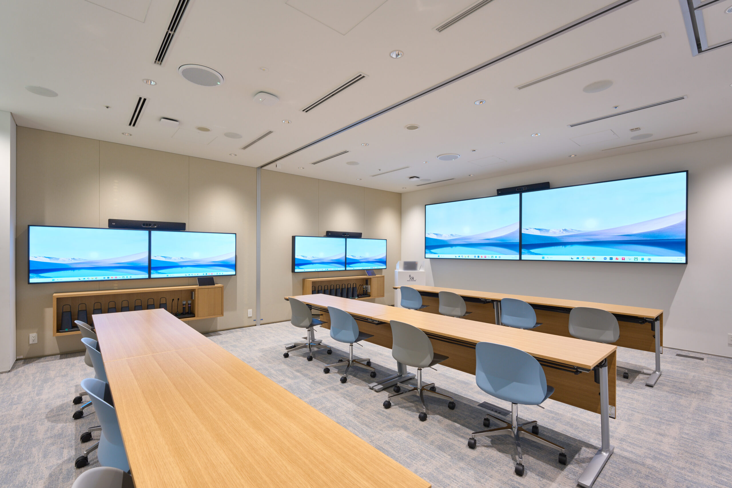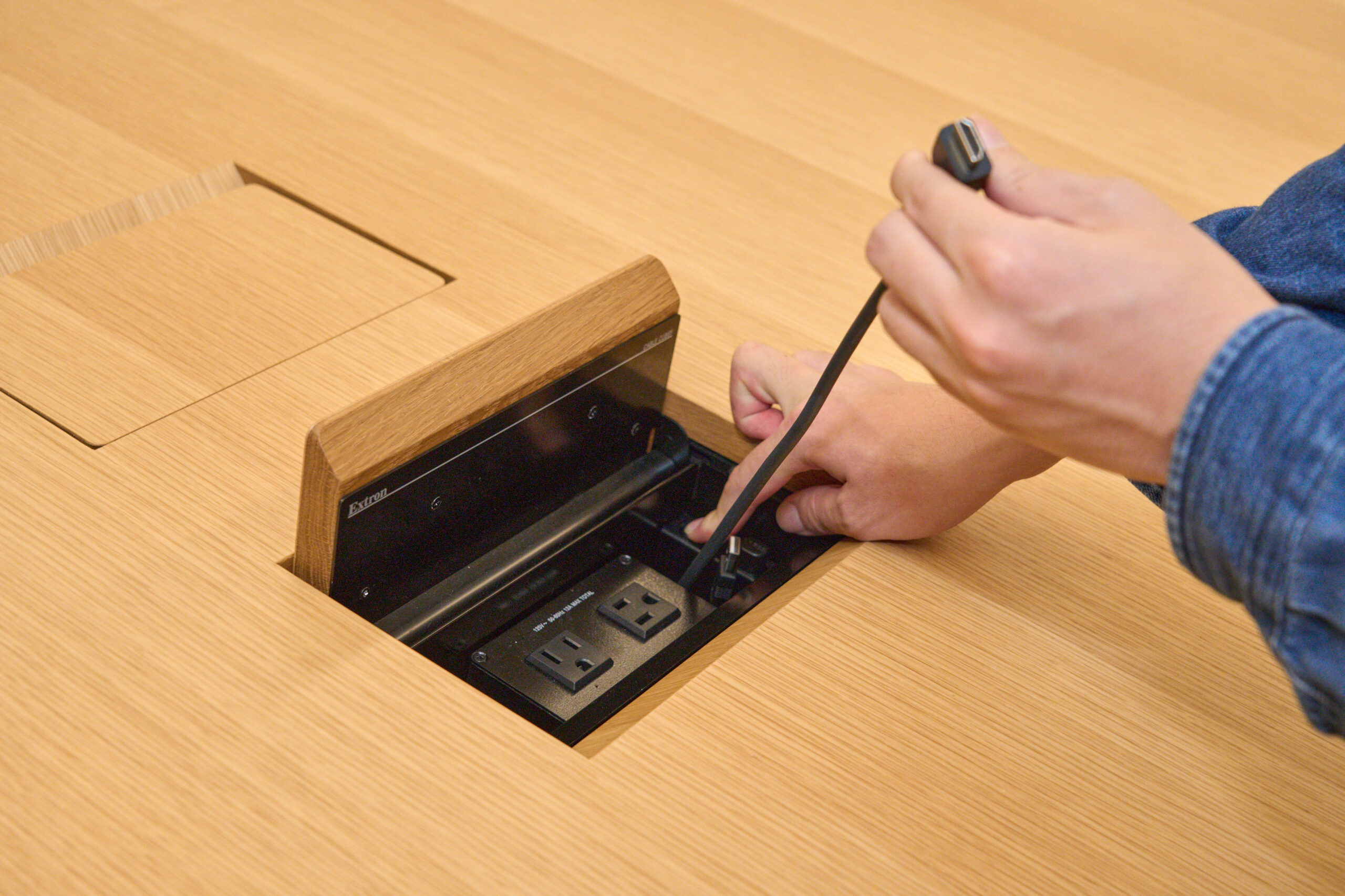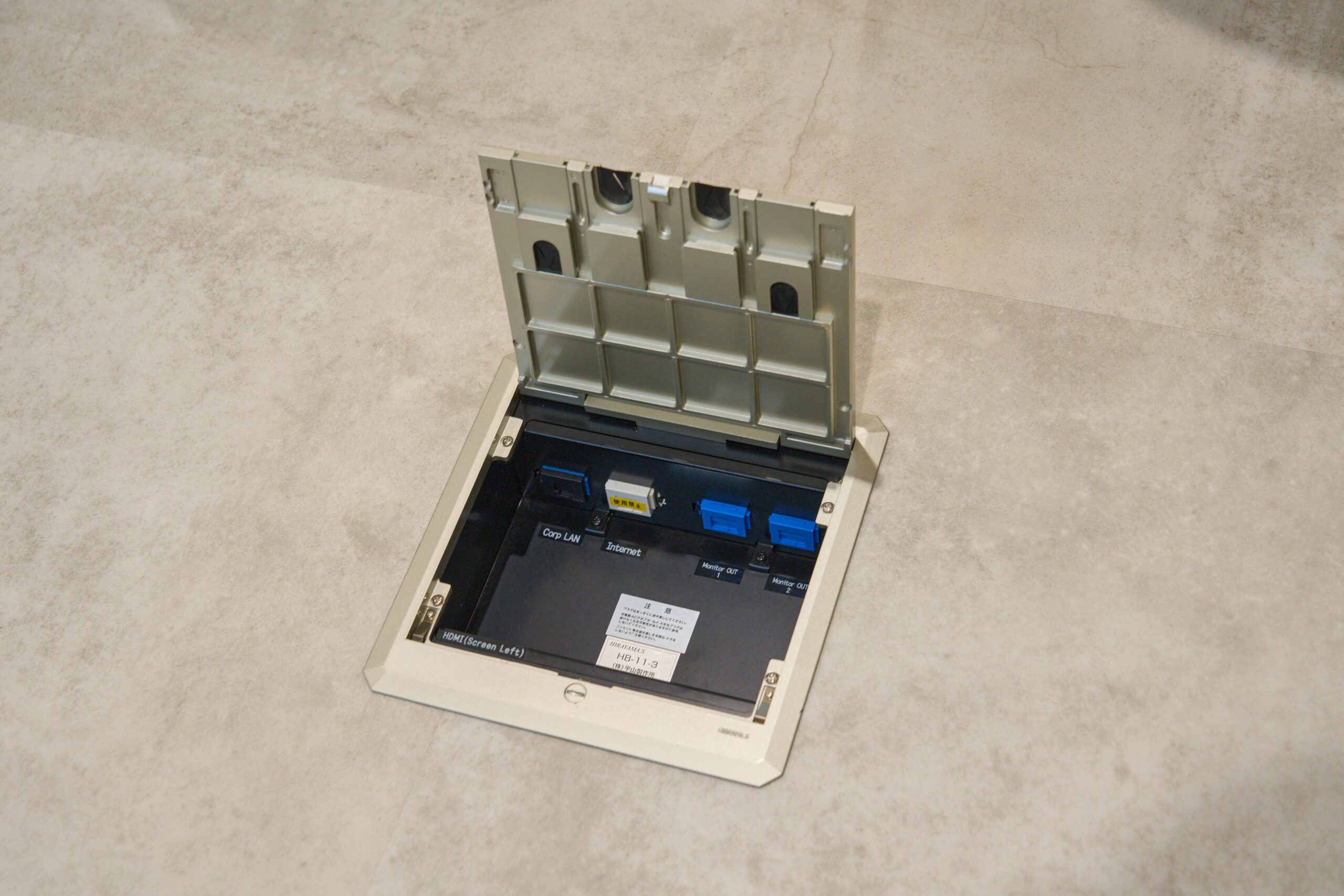 ステージに対向する窓側エリアには、3面の120インチスクリーンを設置しています。こちらもAVコントローラによる直感的な操作が可能で、用途に応じた映像表示をスムーズに行えます。また、1面のみを使用するコンパクトなミーティングでは、フロアパネルにHDMIケーブルを接続するだけで、その位置に近いプロジェクターが自動的に起動し、スクリーンが降りてくる仕組みを構築。音声についても、使用中のスクリーン付近のスピーカーからのみ音声が出力されるため、空間全体に影響を与えることなく必要な場所に必要な音量で運用することができます。操作を意識させないオートメーション化により、シーンに合わせたスマートで快適なミーティング環境を実現しています。