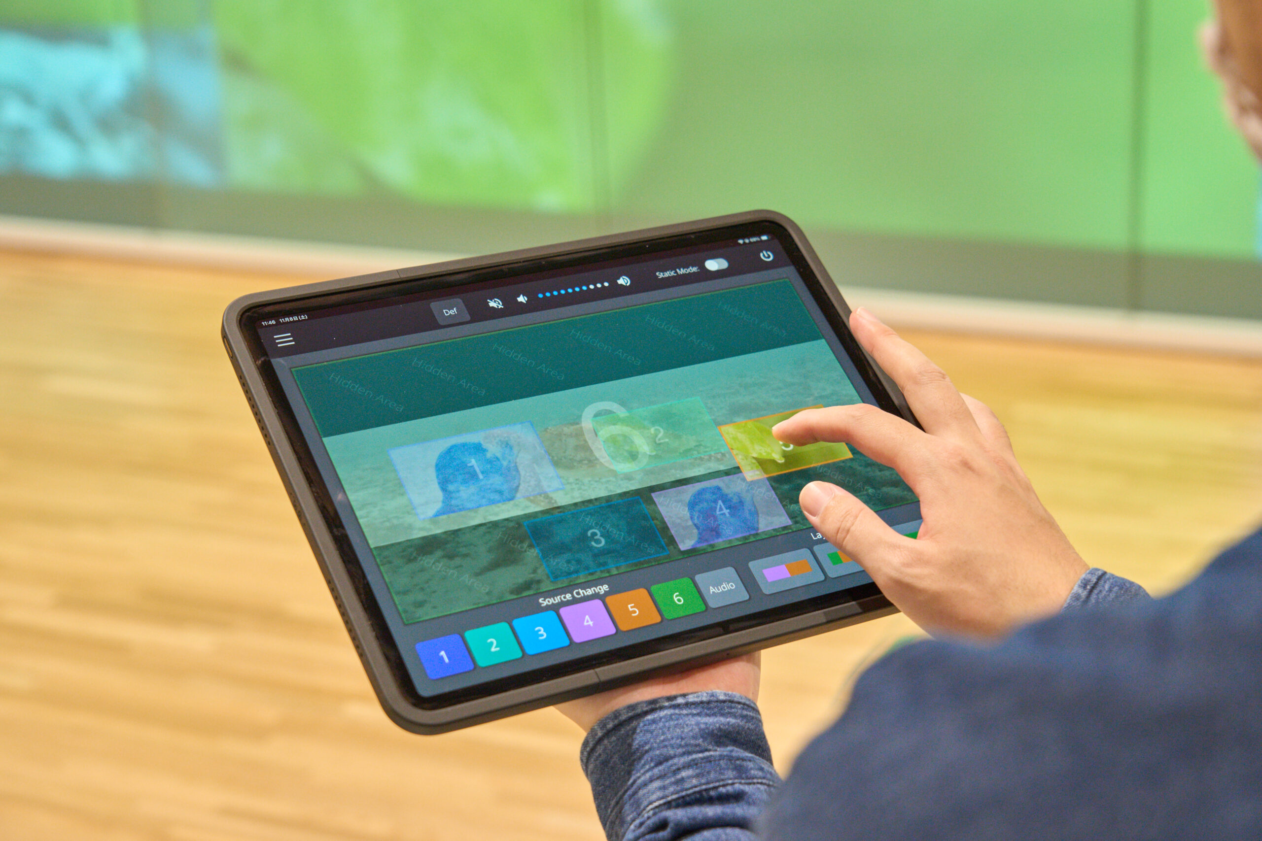 ステージ背面のガラス壁の調光フィルム(※1)面へフレキシブルな映像表示を可能にしています。AVコントローラ上では、サムネイル表示された複数の入力映像を直感的に操作でき、スワイプによる配置変更や、ピンチイン・アウトによるサイズ調整により用途に応じた自在な表示レイアウトをスムーズに構成できます。さらに、カメラが登壇者を自動で捉えて追尾するオートトラッキング機能を搭載。プレゼンターが動きながら話す場面でも、カメラ操作を行うことなく、常に安定したバストアップ映像を撮影します。高い表現力と柔軟な運用を実現しながら、オペレーション負荷を抑えたスマートなステージ環境を構築しています。
