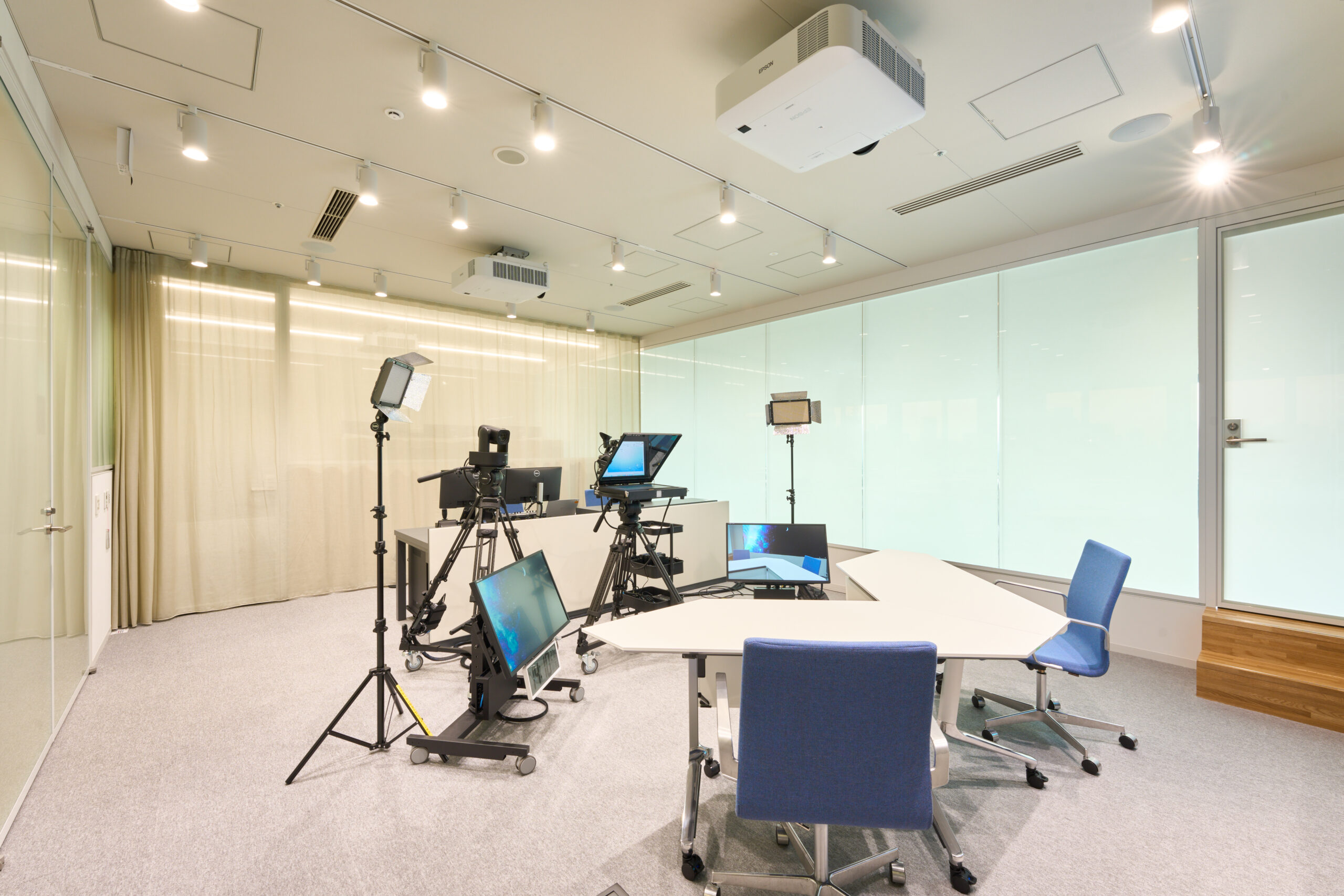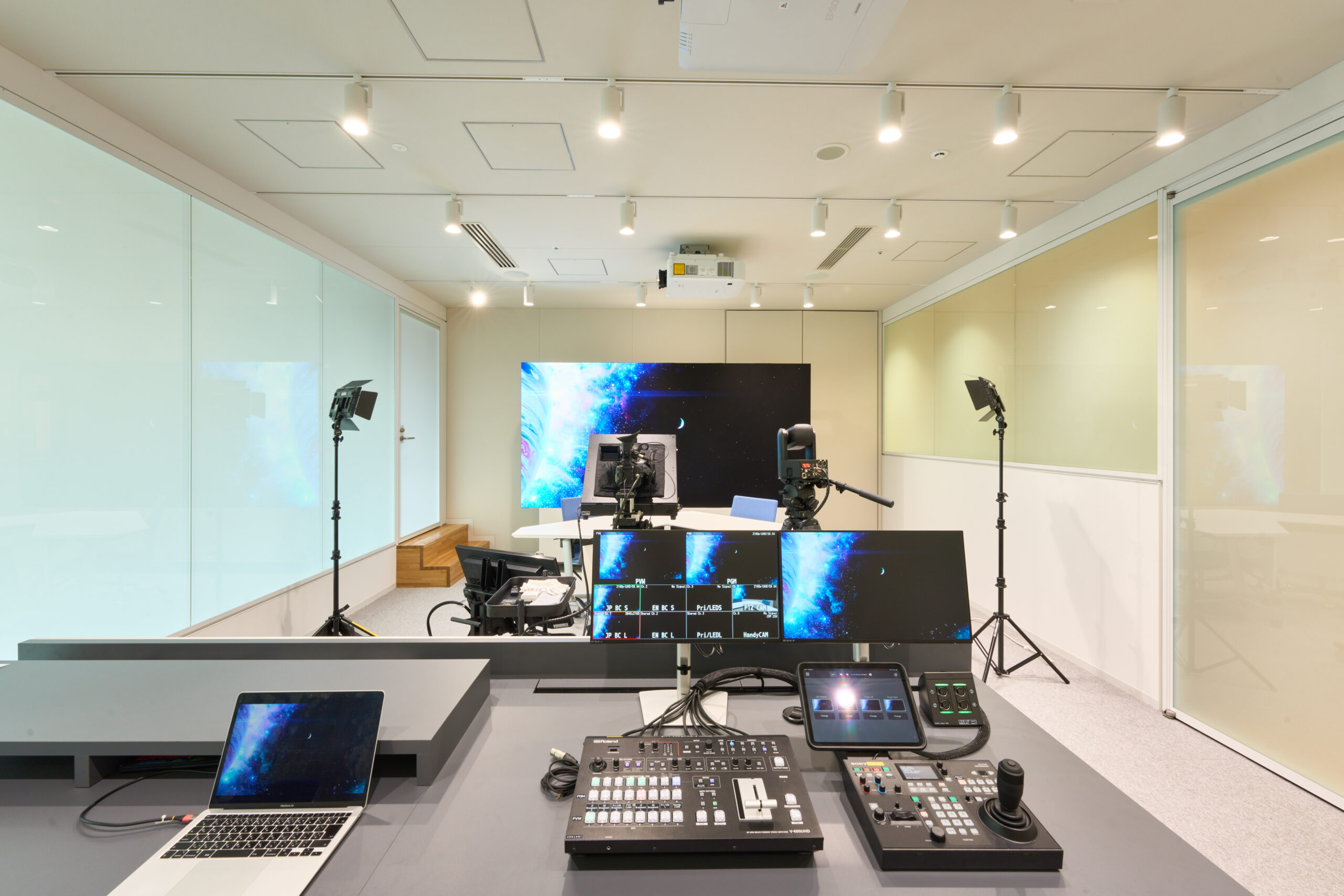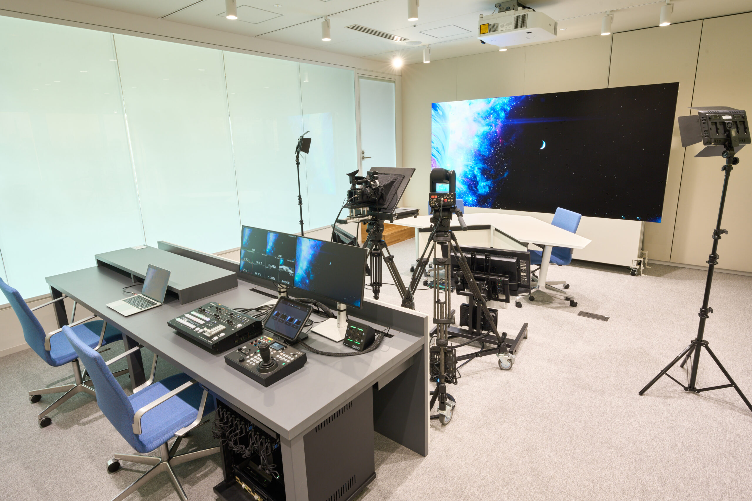 社内向け動画制作やPR映像の撮影に活用するスタジオには、再撮(※2)用のLEDビジョンを採用。従来のクロマキー合成と比べて編集作業の負担を抑えながら、背景表現の幅を広げることが可能です。プロンプターや照明機材といった基本的な設備を備え、さまざまな撮影シーンに対応。一方で、専門知識も必要になるビデオミキサーの操作については最低限でも運用できるよう、AVコントローラからの映像選択やカメラコントローラを用いることで、直感的な操作性を確保しています。専門スタッフに依存せずとも扱いやすい設計とすることで、日常的なコンテンツ制作にも取り入れやすい、ユーザーフレンドリーな企業内スタジオ環境を実現しています。