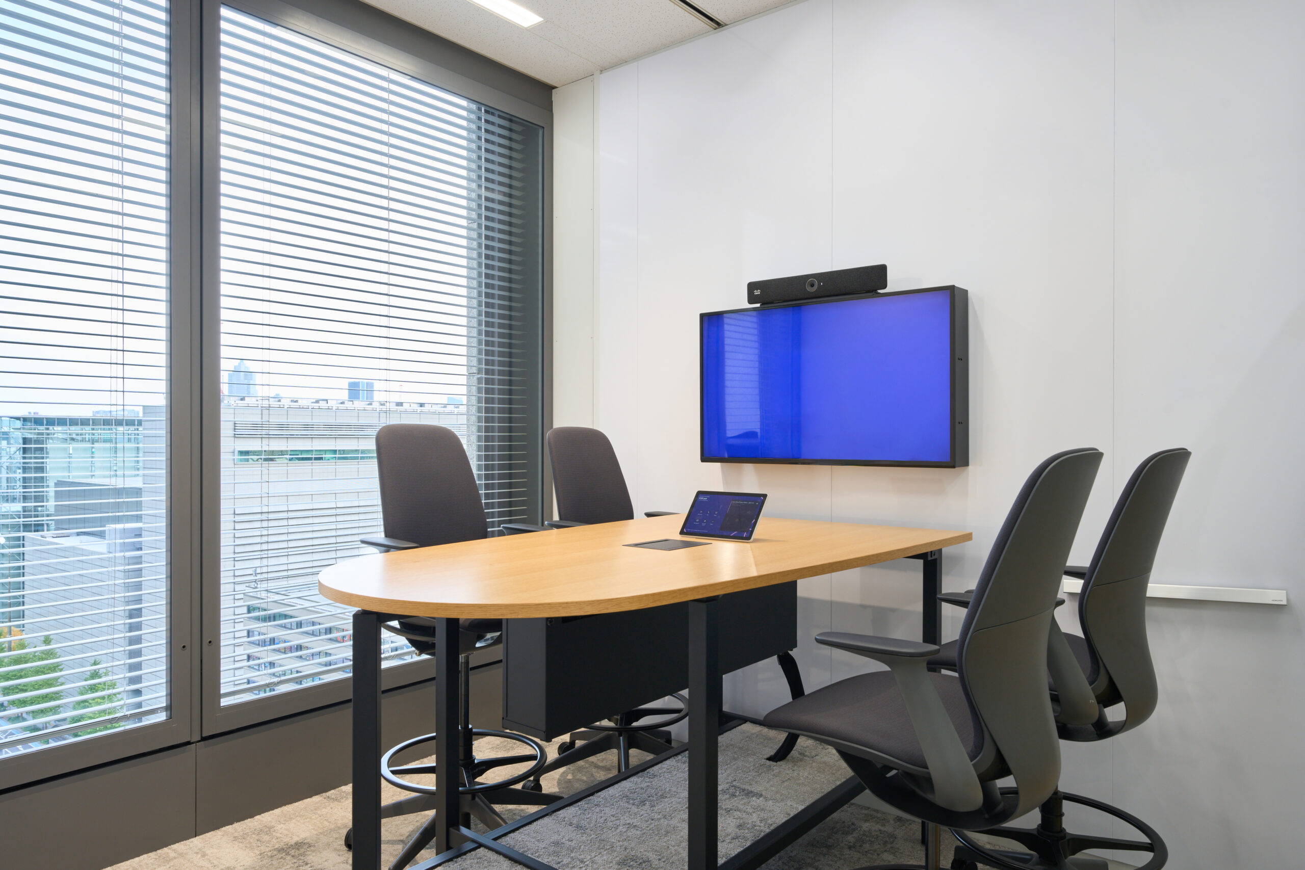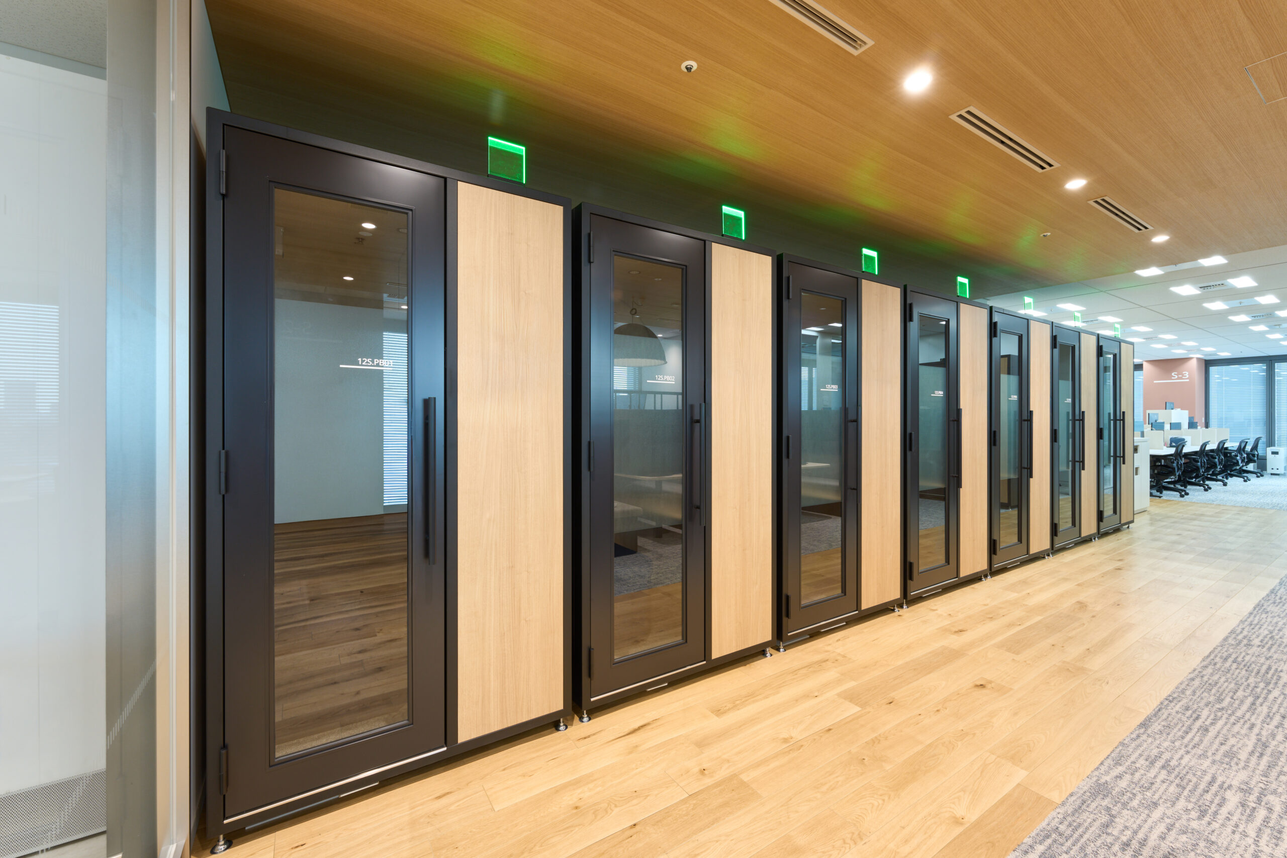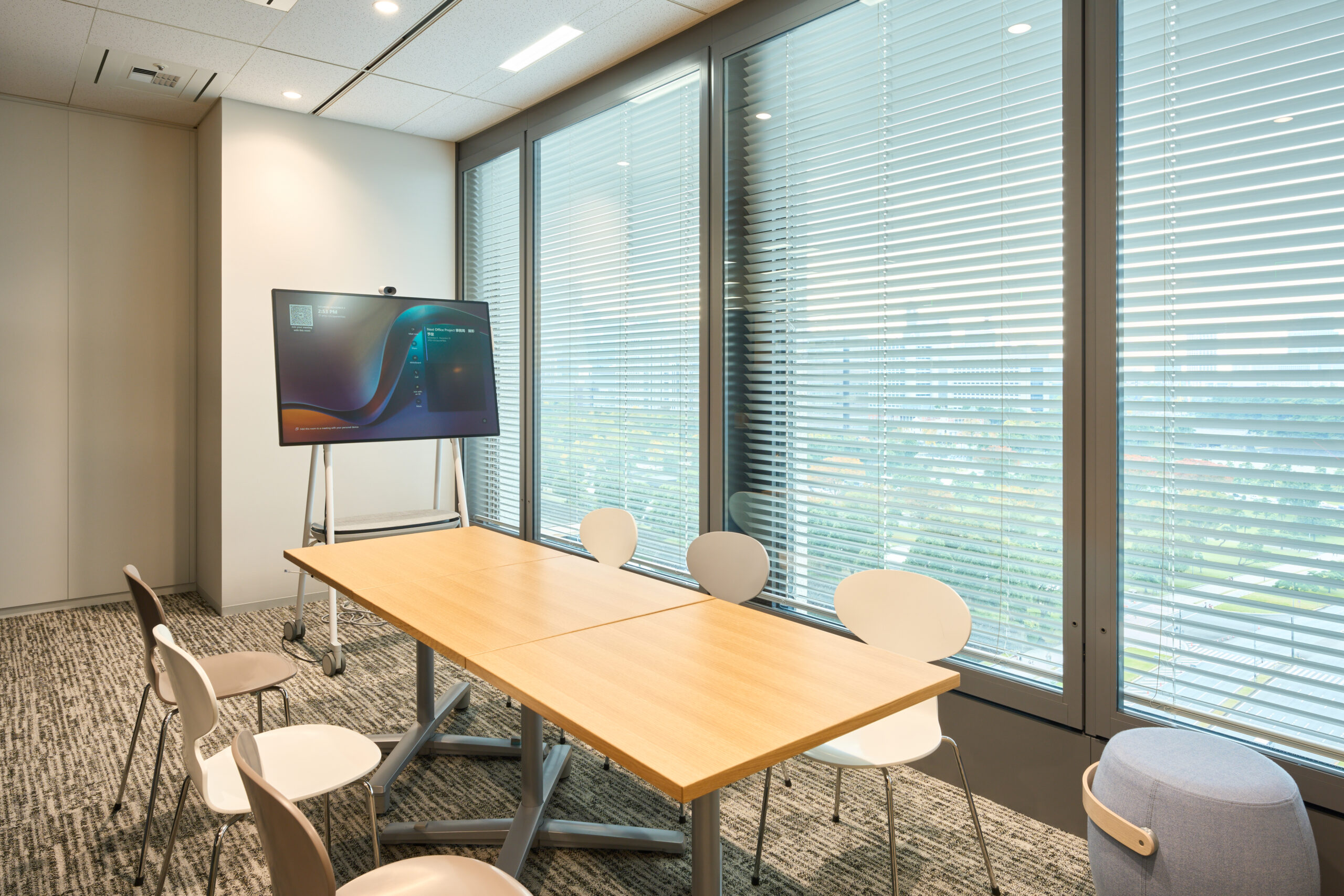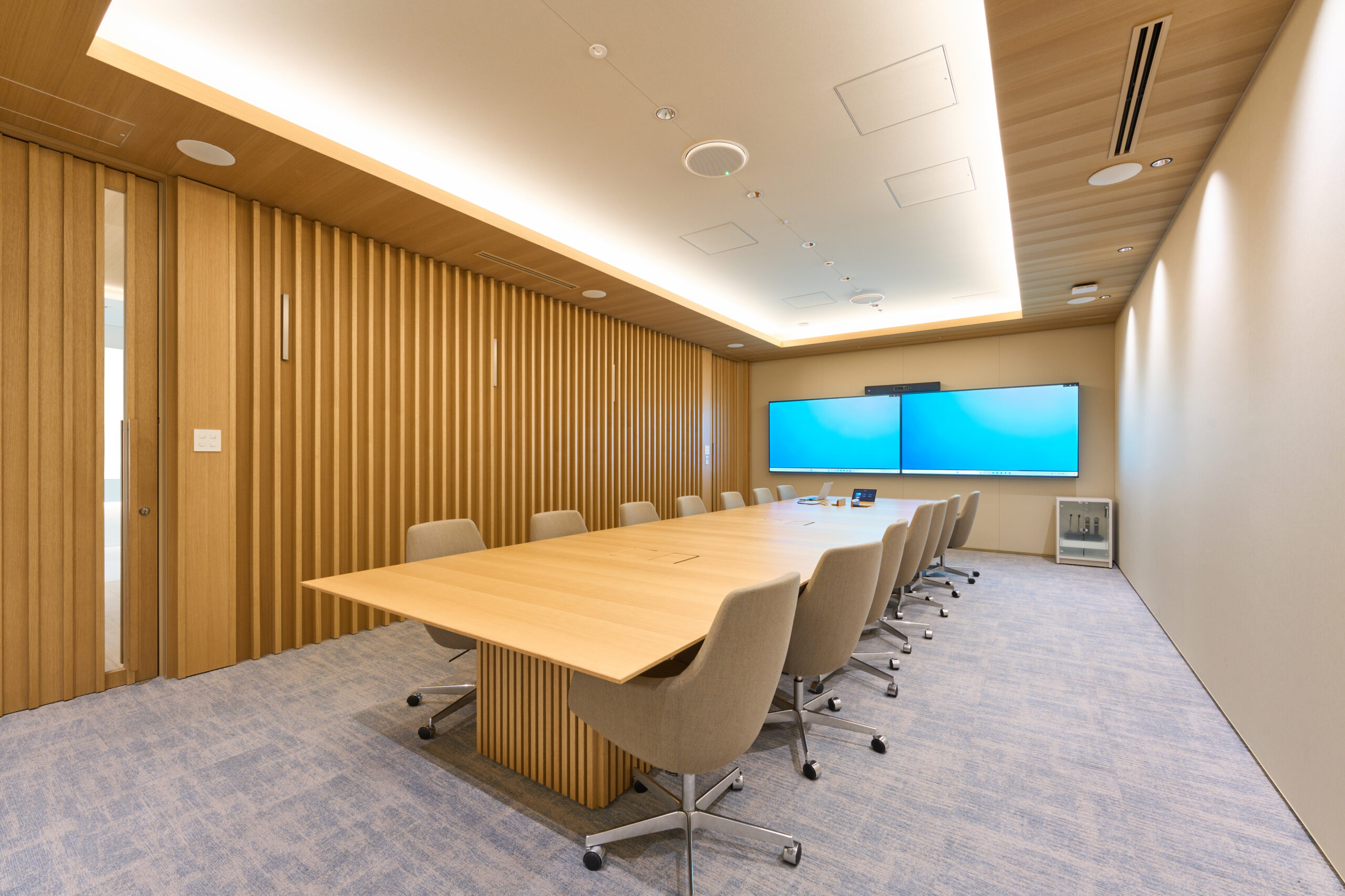 各会議スペースにはケーブルリトラクター(ケーブル収納システム)を設置し、テーブルまわりをすっきりと保てるよう配慮しています。Web会議にも対応しているため、小規模な打ち合わせから大人数のプロジェクト会議まで、その時々のシーンに合った柔軟な開催が可能です。また、インタラクティブボードの設置や個室ブースなども備え、集中した作業からコラボレーションまで、多様な働き方に寄り添う空間構成となっています。