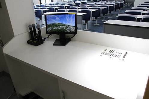 広い作業スペースを重視したフラットな操作卓。コントロールパネルは2021年に整備した631教室と共通のスイッチシステムです。