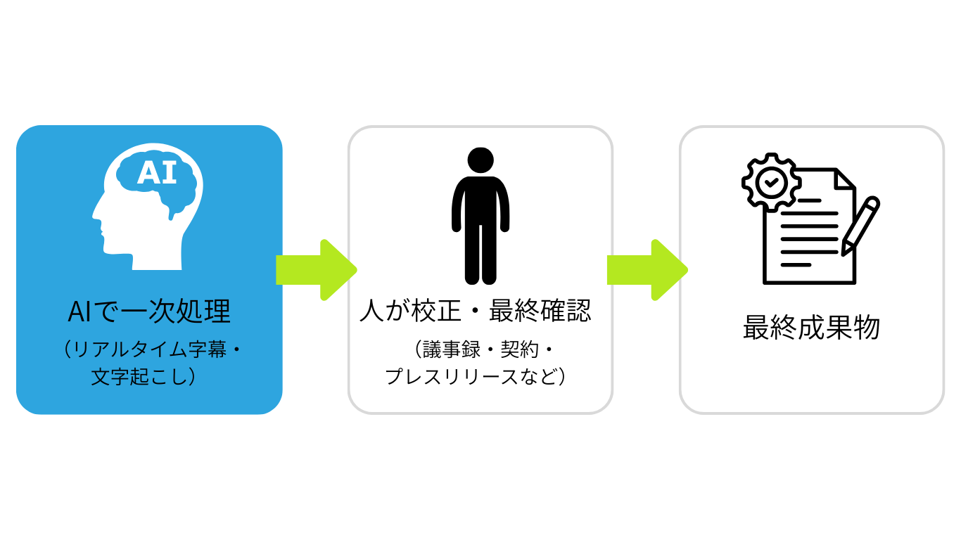 「ハイブリッド翻訳」とは、人による翻訳と機械翻訳(AI翻訳)、あるいは複数の翻訳技術を組み合わせ、スピードと品質の両方をめざす手法のことです。会議中はAIを使って素早く内容を理解し、会議後に人が重要な箇所だけ丁寧に確認・修正する、という流れです。AIに任せきりにするのではなくアシスタント的に利用し、最終的な品質を人間が担保する、という使い方です。これにより、グローバルなコミュニケーションにおける「速さ」「コスト」「正確さ」を同時に向上できると言われています。