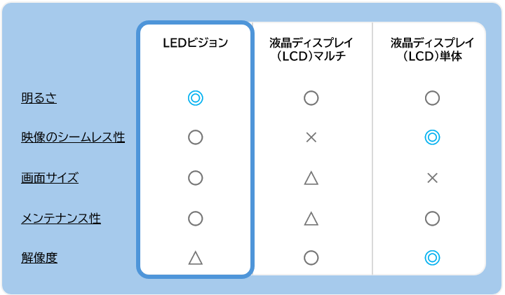 対するLEDビジョンは、映像信号に合わせてLED素子そのものが発色・消灯を行うダイレクトな自発光方式です。光を遮るパネルが必要ないため、不要なときは素子を完全に消灯させて「純粋な黒」を表現でき、極めて高いコントラスト比を実現します。また、光のロスが少ないため、高輝度を維持でき、屋外でも鮮明な視認性を確保できるのが最大の強みです。また、液晶に不可欠な「ベゼル」から解放される点も見逃せません。LEDビジョンは基板そのものを隙間なく敷き詰めることができるため、巨大な画面でも継ぎ目のない、シームレスな一体映像を実現します。一方で、至近距離での繊細な描写については、高解像度という点では液晶ディスプレイのほうが有利です。どちらが優れているかではなく、それぞれの特性を理解し、用途に合わせて適材適所で使い分けることが重要です。